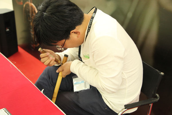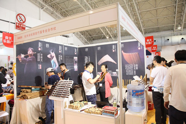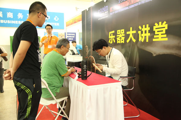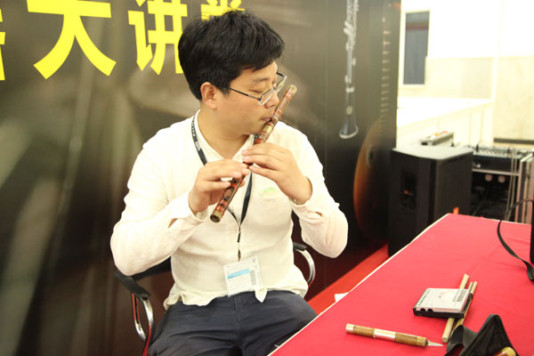 負責現場調音的是杭州余杭銅音竹笛專業合作社下屬會員單位舜天樂器廠負責人郭新明,借助調音器,通過入手試音、查看、修復等環節,五六只竹笛的音準很快就被調好。屆時,前來調音的大爺笑贊道:“郭老師手藝沒的說!沖這技術以后也得來他們的廠子購買產品”。原來,郭老師在PALM 2016北京樂器展也有單獨展位,有竹笛產品及相關配件以供笛友觀摩和選購。