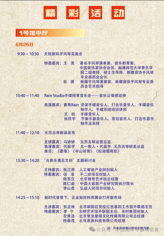 每年北京國際樂器展同期都會舉辦各種形式的系列活動,已逐漸形成了品牌化,今年展會期間也將舉辦涵蓋高端論壇、大師講堂、演奏技術解析、交流展演、器樂大賽等品牌活動,內容將突出藝術與技術、與教育、與生活的融合,以促進樂器制造業和應用領域的科技發展。